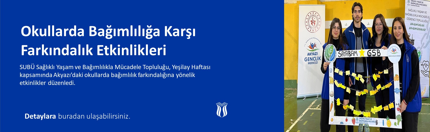 DUYURULAR Tümü 08 Nis 'SUBÜ Konuşmaları 118' Canlı Yayınına Davet 31 Mar 'SUBÜ Konuşmaları 117' Canlı Yayınına Davet 31 Mar 'Diksiyon Eğitimi'ne Davet 30 Mar '2. Spor Şenliği'ne Davet 23 Mar 'SUBÜ Konuşmaları 116' Canlı Yayınına Davet DUYURULAR Tümü 08 Nis 'SUBÜ Konuşmaları 118' Canlı Yayınına Davet 31 Mar 'SUBÜ Konuşmaları 117' Canlı Yayınına Davet 31 Mar 'Diksiyon Eğitimi'ne Davet 30 Mar '2. Spor Şenliği'ne Davet 23 Mar 'SUBÜ Konuşmaları 116' Canlı Yayınına Davet HABERLER Tümü 03 Nis Otizm Farkındalığı İçin Spor Şenliği Düzenlendi 24 Mar SUBÜ Ailesi Bayramlaşmak İçin Bir Aradaydı 11 Mar Öğrenciler İftar Sofralarını Paylaştı 05 Şub Kadın Kata Takımından Karatede Bronz Madalya 29 Oca Dünya Kung-Fu Şampiyonası’nda SUBÜ Rüzgârı TOPLULUK ETKİNLİKLERİ Tümü 01 Nis Öğrenciler İçin Kitap Bağışı Kampanyası Düzenlendi 18 Mar İftarlarını Huzurevi Sakinleriyle Yaptılar 18 Mar Geleneksel Okçuluk Etkinlikleri Başlıyor 16 Mar Okullarda Bağımlılığa Karşı Farkındalık Etkinlikleri 16 Mar Kadınların Katkılarıyla Kolektif Eser Oluşturdular