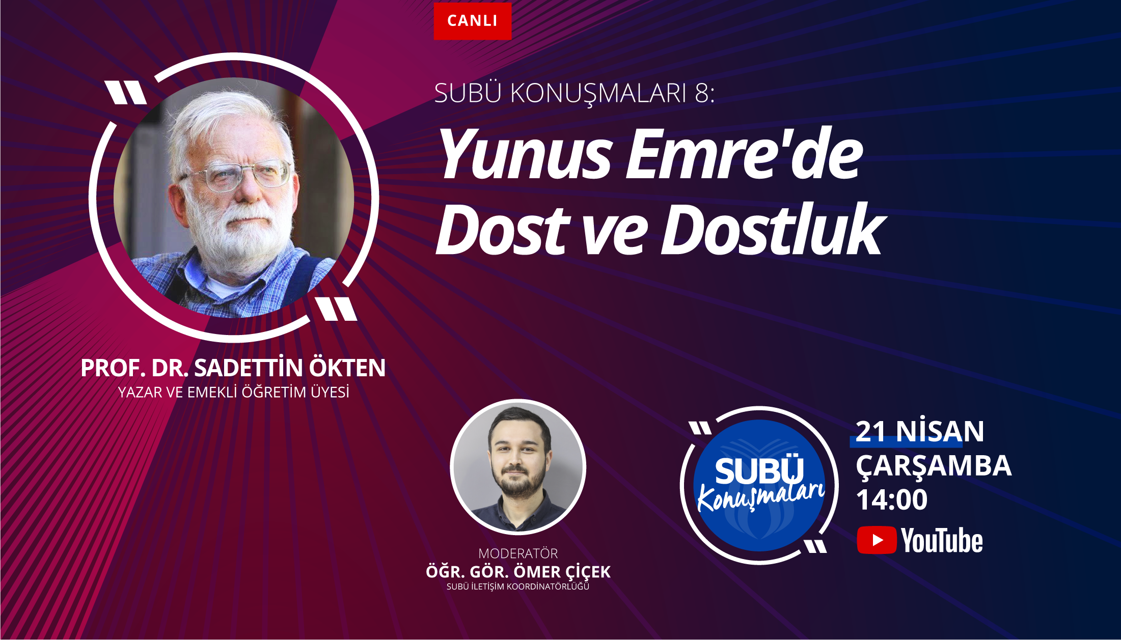 Sakarya Uygulamalı Bilimler Üniversitesi (SUBÜ) tarafından düzenlenen SUBÜ Konuşmaları etkinliğinin 8. konuşmacısı islâm medeniyeti ve şehir estetiği üzerine düşünceleriyle birçok esere imza atan yazar ve akademisyen Prof. Dr. Sadettin Ökten olacak. ‘Yunus Emre’de Dost ve Dostluk’ başlıklı söyleşinin moderatörlüğünü SUBÜ İletişim Koordinatörlüğü’nden Öğretim Görevlisi Ömer Çiçek gerçekleştirecek. Üniversitenin YouTube kanalı SUBÜ Haber’den canlı yayınlanacak söyleşide; Yunus Emre’nin divanında dost kavramını nasıl ele aldığı, dostluktan neyi kastettiği gibi konular üzerinde durulacak. Ayrıca bu kavramların günümüzdeki yansımaları ve yerine göre ifade ettiği anlamlar konuşulacak. 2021 yılı Cumhurbaşkanlığı tarafından ‘Yunus Emre ve Türkçe Yılı’ olarak ilan edilmişti. SUBÜ Konuşmaları her Çarşamba saat 14.00’de herkese açık olarak gerçekleştiriliyor.